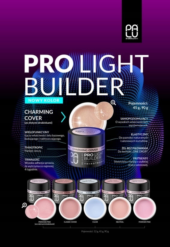 PRO LIGHT BUILDER GEL to żel, który posiada właściwości produktu bazowego, budującego i nabłyszczającego. W swojej budowie zawiera substancje adhezyjne, które zwiększają przyczepność do naturalnej płytki paznokcia, substancje budujące i nabłyszczające. Aby osiągnąć optymalny efekt przyczepności przy cienkich, problematycznych płytkach warto zastosować wcierkę z dowolnej bazy Palu.
