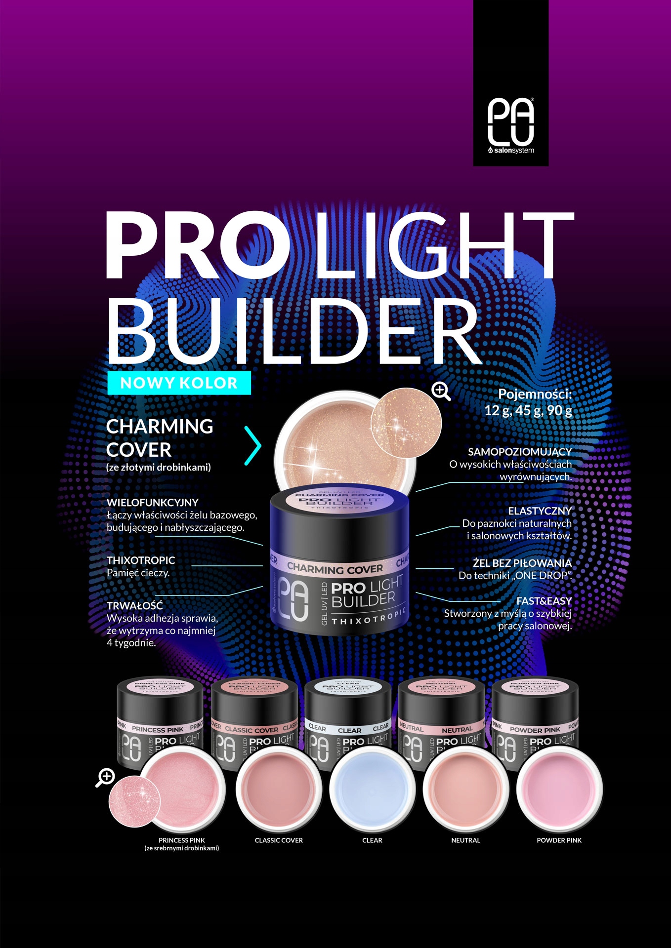 PRO LIGHT BUILDER GEL to żel, który posiada właściwości produktu bazowego, budującego i nabłyszczającego. W swojej budowie zawiera substancje adhezyjne, które zwiększają przyczepność do naturalnej płytki paznokcia, substancje budujące i nabłyszczające. Aby osiągnąć optymalny efekt przyczepności przy cienkich, problematycznych płytkach warto zastosować wcierkę z dowolnej bazy Palu.