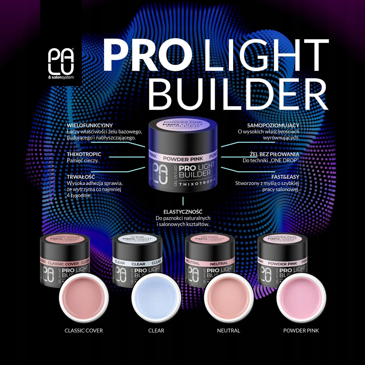 PRO LIGHT BUILDER GEL to żel, który posiada właściwości produktu bazowego, budującego i nabłyszczającego. W swojej budowie zawiera substancje adhezyjne, które zwiększają przyczepność do naturalnej płytki paznokcia, substancje budujące i nabłyszczające. Aby osiągnąć optymalny efekt przyczepności przy cienkich, problematycznych płytkach warto zastosować wcierkę z dowolnej bazy Palu.
